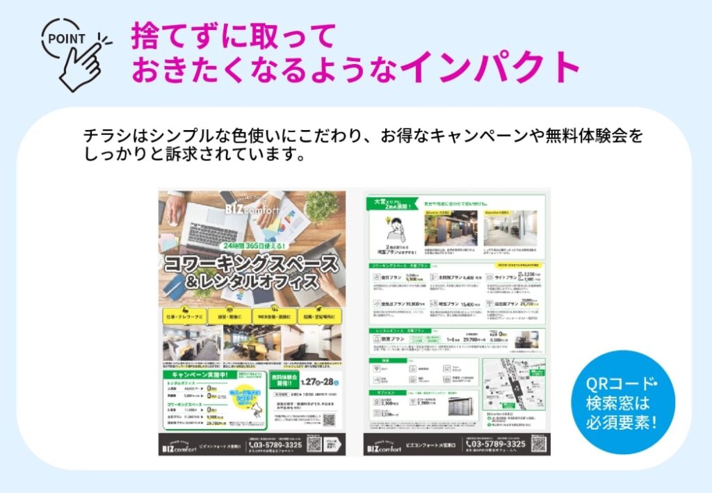 印刷物や販促物は、ターゲットの手元に直接情報を届けるメディアです。チラシ・パンフレット・ダイレクトメール(DM)・カタログ・ショップカード・POPなどが該当します。