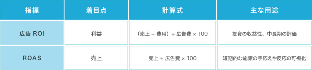 施策ごとにROASで反応を確認しつつ、事業全体の運用方針や予算判断では広告ROIを重視する。このように、両者は併用することで広告運用の精度をより高めることが可能です。