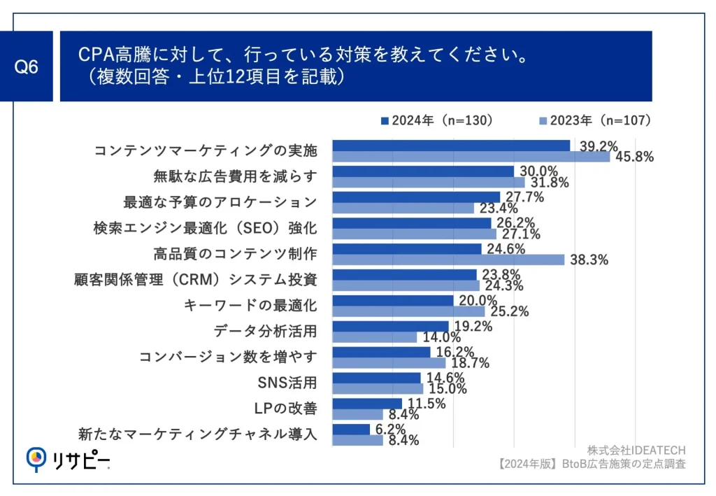株式会社IDEATECHが2024年に公開している調査では、CPA高騰への対策として「無駄な広告費用を減らす」と30%の調査対象者が挙げており、費用対効果の悪いチャネルやセグメントに対する支出を見直す重要性が伺い知れます。