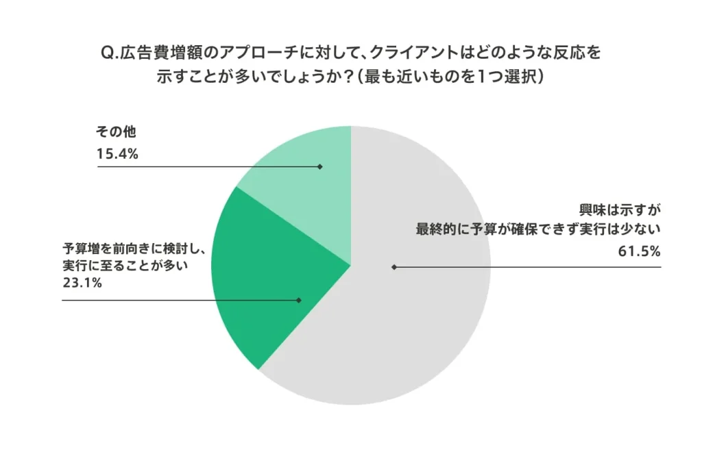特に、広告予算の増額ともなると、さまざまなステークホルダーから合意を得る必要があり、一筋縄ではいかないのが実情です。株式会社WACULがWeb広告代理店で経営やマネジメントに携わる人々を対象に行った調査では、クライアントの61.5%が「興味は示すが、最終的に予算が確保できず実行は少ない」との対応だったと判明しており、その難易度の高さが伺えます。