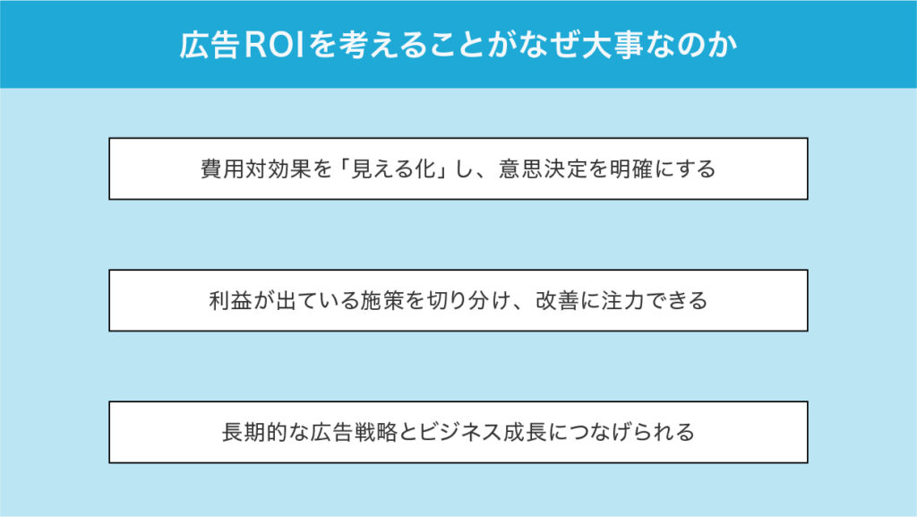 広告ROIの基本を理解したところで、次に大事なのが「なぜ広告ROIという視点が広告運用にとって不可欠なのか」という点です。主な理由としては、以下の3つが挙げられます。それぞれ個別にみていきましょう。