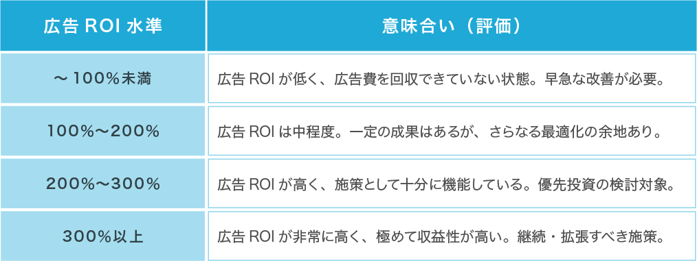 広告ROIが100%を超えると、「投資した額と同等以上の利益が出ている」状態です。逆に100%未満であれば、広告施策としては赤字に近い状況と判断できます。