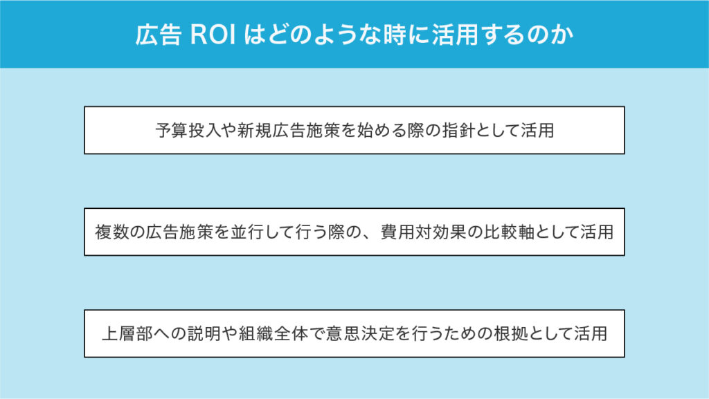 具体的には、広告ROIは次の3つの活用方法が考えられます。それぞれのタイミングにおいて広告ROIが果たす役割をみていきましょう。