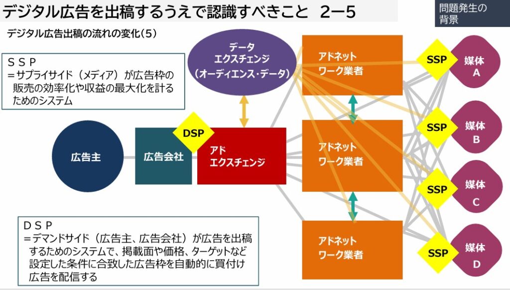 アドネットワークは、 複数のメディアの広告枠をまとめて買い取り、固定価格で販売する仕組みでした。広告主はアドネットワークに加盟している複数のメディアにまとめて広告を配信できますが、どのメディアに広告が配信されているかを詳細に把握しづらく、広告枠ごとの効果を評価しにくいという課題がありました。