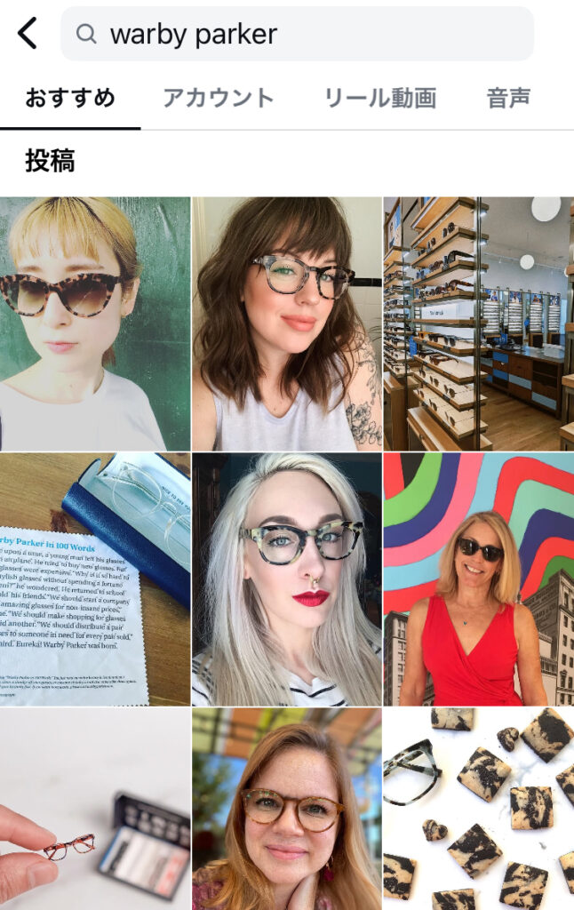 こうしたコミュニティ活用は、D2Cブランドにも広がっています。アメリカの眼鏡ブランド「Warby Parker」は、ユーザーにInstagram投稿を呼びかけており、「#warbyparker」で検索すると数多くの着用画像が見つかります。