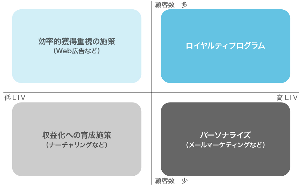 また、顧客のLTV分布の差異に応じた施策の例として、下図のようなマトリックスも考えられるでしょう。
