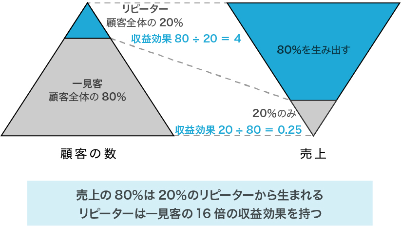 「パレートの法則」という言葉を知っている人も多いと思います。これは「80:20の法則」ともいわれ、「20%のリピーター顧客が売上げの80%を占める」という法則です。上図で示しているように両者の収益効率を計算してみるとその差は歴然としています。優良顧客層にリソースを振り向けることが重要であることを、よりはっきりとイメージしていただけるのではないかと思います。