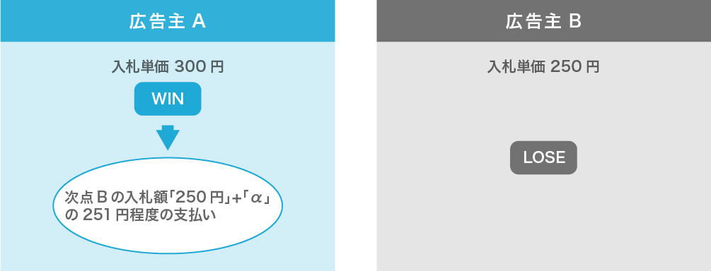 簡単な具体例で考えてみましょう。広告主Aが300円、Bが250円で入札してAが勝った場合、Aは自分の入札額300円ではなく次点Bの250円に僅かな加算をした(例:+1円)251円程度を支払います。この方式により、広告主は自分が入札に提示した最高額すべてを支払わずに済むため、適正価格での入札をしやすくなります。