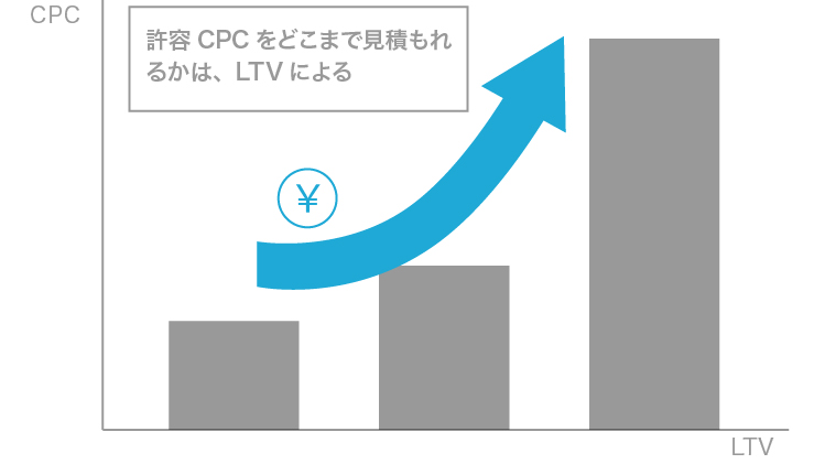 よって、CPCの目標は最終的な利益貢献度を考慮して設定することが重要です。たとえば、ある業種で顧客一人当たりの平均利益(LTV)が10万円であれば、1000円を費やしてでも獲得すべきかもしれませんが、LTVが1万円であれば、同じCPCを許容していては利益を圧迫すると考えられるため、実際には許容できないと判断できるでしょう。