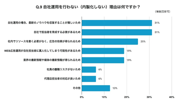 実際に、当社と株式会社キャスターが合同でBtoB企業を対象に行った調査では、インハウスで広告運用を行っていない企業は内製しない理由として「自社運用の場合、最新ノウハウを収集することが難しいため」が31%と最多」となっていました。