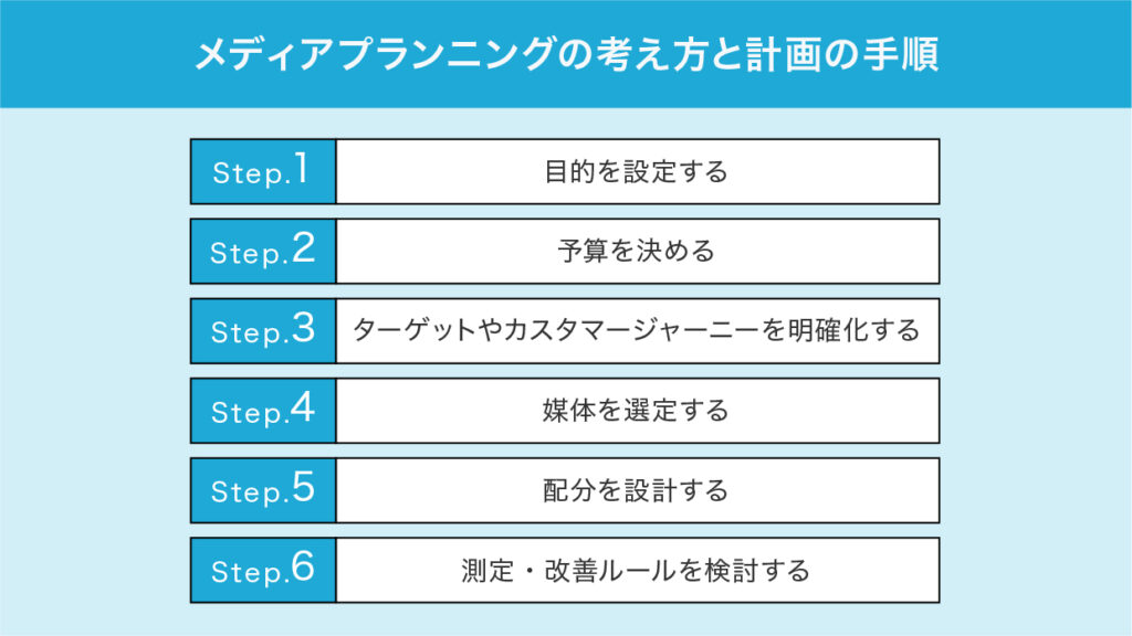 メディアプランニングの基本的なプロセスは、以下6ステップに大別できます。