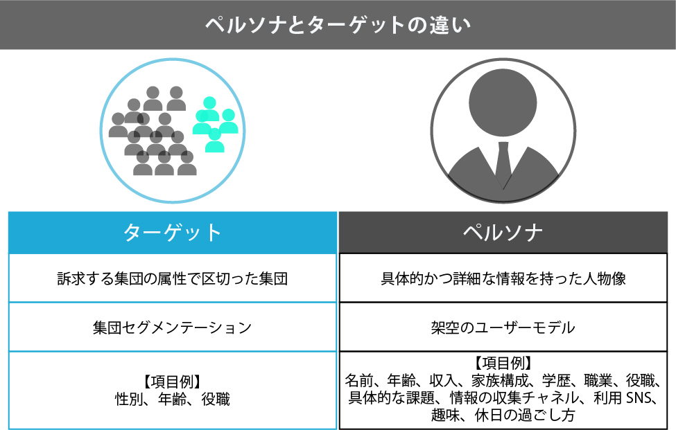 単に「20代女性」「中小企業の経営者」といった属性だけでは不十分で、購買行動や関心領域まで踏み込んだ「理想の顧客像」であるペルソナの定義が必要です。