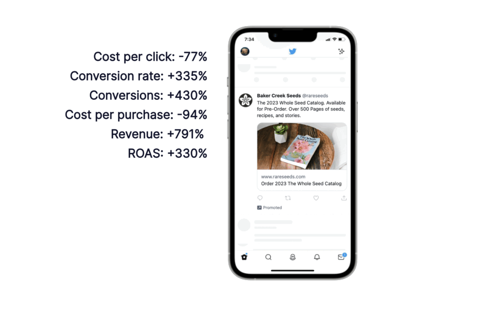 米国の種苗通販企業、Baker Creek Seeds社は、2023年秋のカタログ発売にあわせてX広告を活用しました。特に「Whole Seed Catalog」の予約販売を中心としたキャンペーンにおいて、精緻なターゲティングとクリエイティブのA/Bテストを実施したと報告されています。