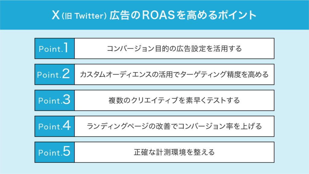 X広告は、配信のスピード感ゆえに広告費が一気に消化され、結果が伴わなければ「投資が無駄になる」リスクも存在します。それを踏まえると、X広告でROASの最大化を図る上では以下のポイントを意識することが大切です。次項より、詳しく解説します。