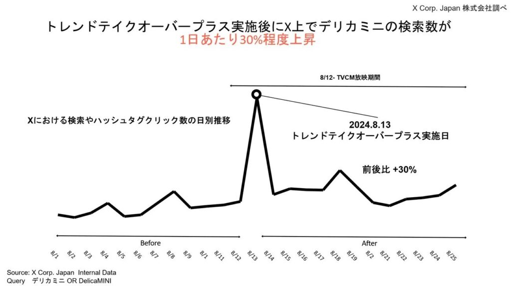 テイクオーバーは、Xのタイムラインや検索タブを1日限定で独占できることが特徴です。検索トレンドの最上位に表示されるため、圧倒的な露出と話題化を狙うキャンペーンに適しています。