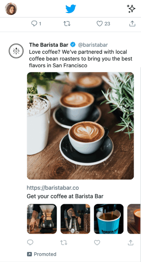 プロモ広告は、Xのタイムライン上でオーガニック投稿と同じ形式で表示される広告フォーマットです。通常のツイートに「プロモーション」というラベルが付くのみで、ユーザーのスクロール中に自然に溶け込みやすい特徴があります。そのため、広告に対する心理的ハードルが低く、クリック率やエンゲージメントの向上が期待できます。