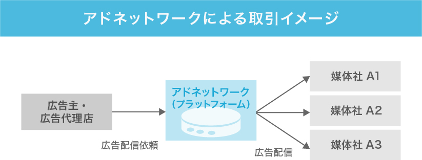 アドネットワークの主要な当事者は以下三者です。アドネットワーク企業が媒体社から在庫を預かり商品化し、広告主に販売するシンプルな取引形態といえるでしょう。