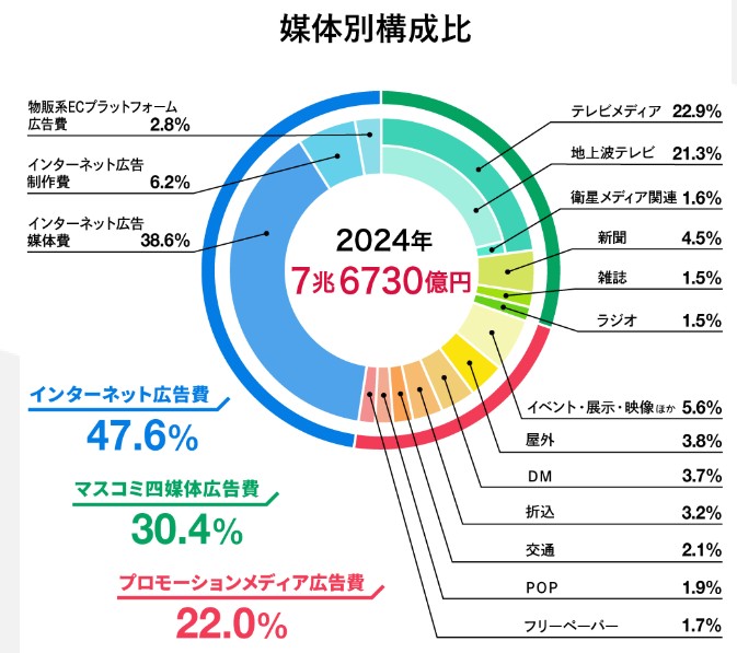 日本でも2024年の電通の調査では総広告費における構成比を見るとマスコミ四媒体が30.4%、インターネットが47.6%となっておりネット広告のほうが大きな市場です。