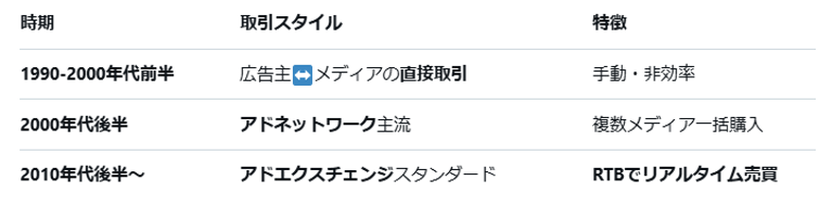 市場の拡大に比例しアドテクノロジーも進化してきました。初期は広告主と媒体側が直接取引をしていましたが、2000年代には広告発注者が複数の媒体の広告枠を一括購入できるアドネットワークが登場。