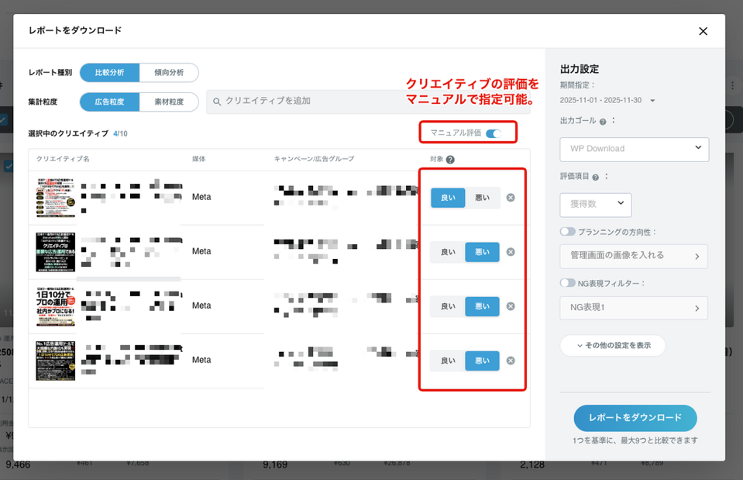 「マニュアル評価」モードをONにすることで、各クリエイティブに対して「良い」「悪い」の評価を自由に設定できます。媒体の自動評価とは異なる基準で、クリエイティブを分類して分析することが可能になります。